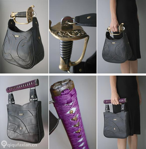 这两个包包手提部分很有特色,设计成西洋剑和日本武士刀的手柄,完全是按照真实的手柄大小和材料制作,采用黄铜、硬木、钢等材料,而这包包的部分采用高品质的意大利皮革,是女剑客和女忍者出门必备之包包。by empire33。