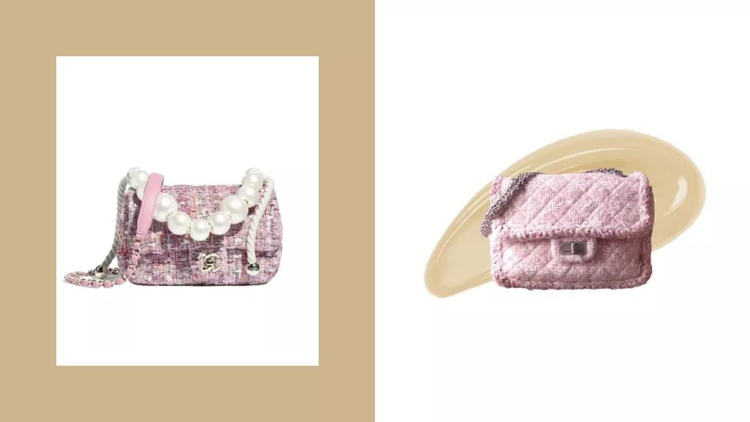 这两款包相似度应该有百分之九十了,同样的粉色粗呢,同样的口盖包,唯一不同的是左边新款加了一串珍珠手链。这可难不倒aloha君,完全可以拿出妈妈压箱底的珍珠项链来DIY一番。