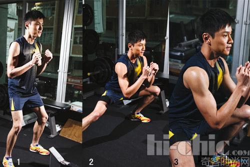 Step2:提起脚踝往后踏及蹲下至膝关节约九十度,在过程中吸气