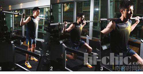 Step1:手持杠铃置于上斜方肌之,膝关节微弯,保持躯干稳定
