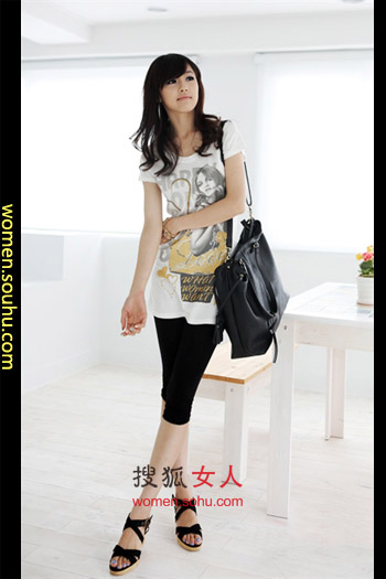 时尚解析:白色长款T恤搭配黑色打底裤,上半身为浅色给人膨胀感,下半身黑色起到很好的收缩效果,搭配简单款黑色大包,没有多余累赘。