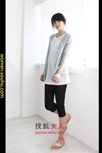 时尚解析:蓝天白云的搭配给人清新感觉,基本款白色T恤搭配蓝色开襟罩衫,下身微休闲款打底裤,非常强烈的对比。