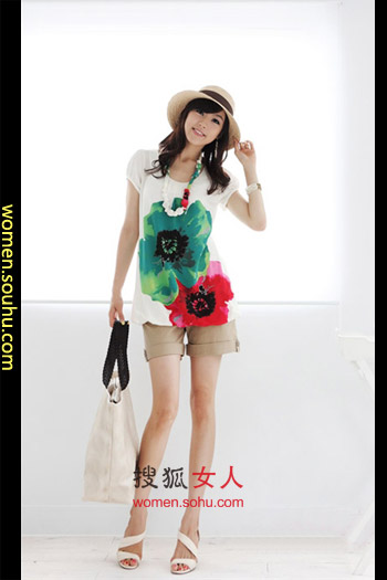 时尚解析:白色背心大朵水墨风格艳丽花朵图案装饰,搭配卡其色卷边小短裤,完美的夏日俏女郎。
