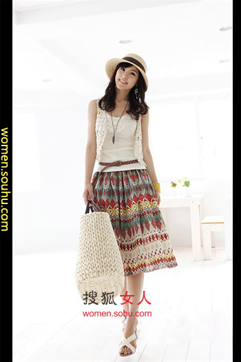 时尚解析:白色吊带搭配针织小背心,印花雪纺半身裙,草编包包与同材质帽子,氧气田园女就这样打造完成。