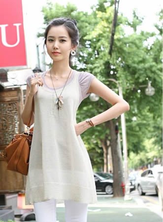 针织背心式的连衣裙,虽然透明但是却有轻熟女的风范。白色的修身七分裤与针织连衣裙的搭配非常的合适。