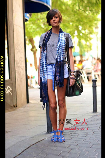 时尚解析:搭配灰蓝色系,加入少量配饰。大号背包提高整身质感。夏天佩戴围巾都爱选择清凉的颜色。蓝色缎带腰带和镂空鞋注重整体。黑MM穿亮色看上去很有生气。