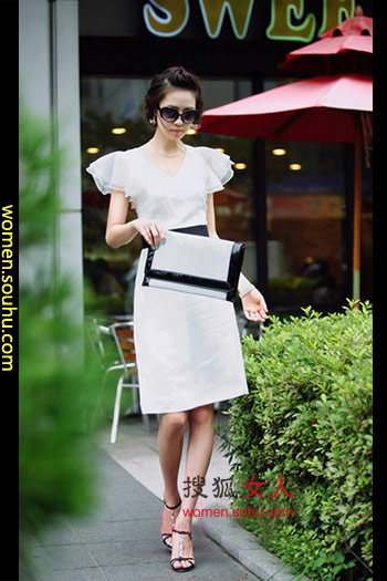 时尚解析:纯白色连衣裙,雪纺蝴蝶袖设计突出飘逸感,黑色腰带凸显曲线美,黑白经典组合,展现OL干练本色。