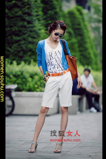 时尚解析:随意百搭,时尚气质,上身白色字母T恤搭配蓝色罩衫休闲随意,下身西装款短裤展现OL时尚一面。