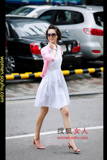 时尚解析:完美淑女必备,粉色针织开襟小罩衫搭配白色百褶连衣裙,经典时尚,整体设计在体现都市白领气质中不失可爱甜美淑女味。