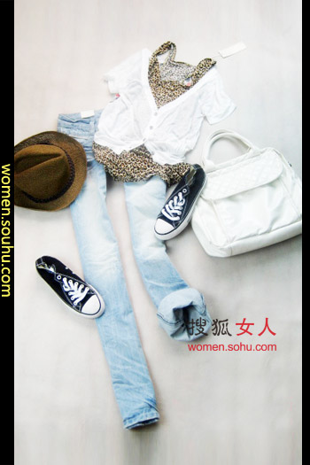 时尚解析:上身豹纹背心外搭白色针织小衫,配以长宽牛仔裤,这身装扮看似中规中矩,最适合下雨天穿着,谁说雨天不可以很性感?看我们的小豹纹。