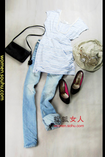 时尚解析:同样的牛仔裤,加上今年大热的蓝白条纹,搭配休闲小帽子,休闲风就此呈现,小黑包体现成熟味道。
