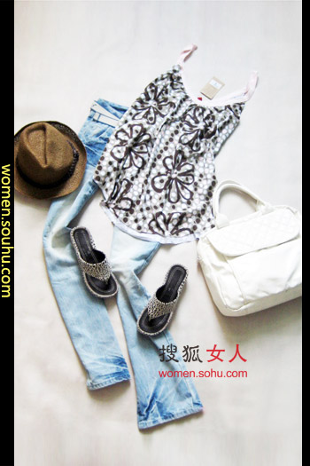 时尚解析:牛仔裤搭配花朵图案吊带背心,最适合阳光明媚的日子,踢双拖鞋去逛街,搭配棕色帽子,个性又帅气。