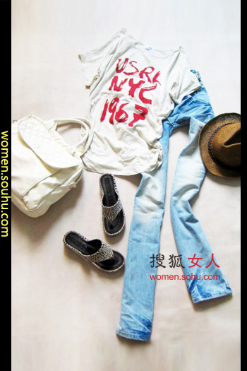 时尚解析:经典的白T恤搭配牛仔裤,淡色牛仔搭配露肩T恤,胸前经典红色字母图案,甜美又不失一点小性感。