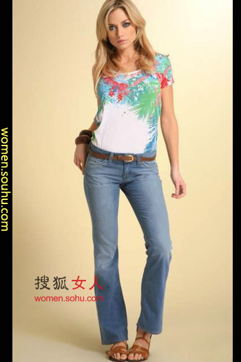 时尚解析:基本款复古静版牛仔裤,搭配充满热带雨林气息亮丽花纹的白色T恤,皮质腰带带出浓郁的欧美休闲气息。