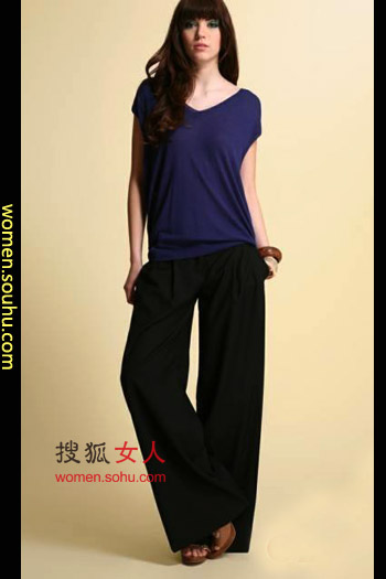 时尚解析:深蓝色V领T恤,搭配黑色宽腿裤,很好的遮盖了身上多余肉肉,整体线条笔直,塑造了一种干练OL的休闲风格。