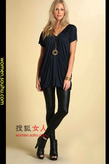 时尚解析:深蓝色绸缎T恤,看似随意实则起到很强的修身效果,金属挂坠成为全身亮点,搭配黑色紧腿裤、高跟鞋,充满摩登气息,打造个性酷女郎。