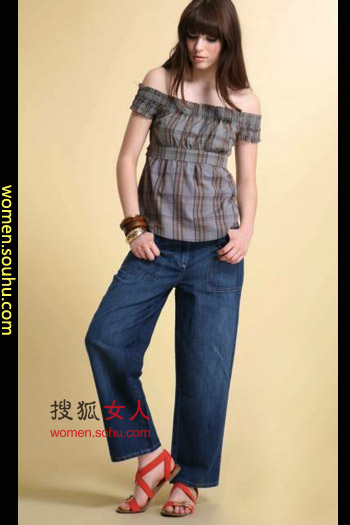 时尚解析:宽腿深色牛仔裤,搭配格子露肩衬衫,胸前松紧设计凸显欧美人性感身材,大手环低调的张扬着,搭配红色平底鞋,舒适的小高调。