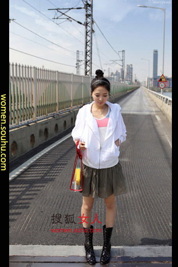 时尚解析:彩色T恤罩以宽松纯白外套,搭配棕色伞状裙,水玉点点小雨靴惹人怜爱,透明塑料包包不怕水,这一身非常适合阴晴不定的天气。