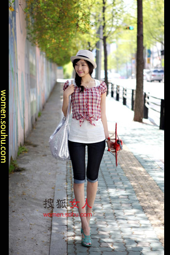 时尚解析:修身五分牛仔裤搭配纯洁的简单款白色背心,活力十足,正午太阳炎热,拍晒黑?搭件格子短衬衫吧,立刻变得淑女了,约会去吧。