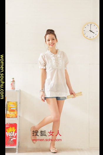 时尚解析:牛仔裤+白衬衫,永恒的经典搭配,上身衬衫领子层叠与公主袖的设计,使女孩干练帅气中多了一丝可爱气息。