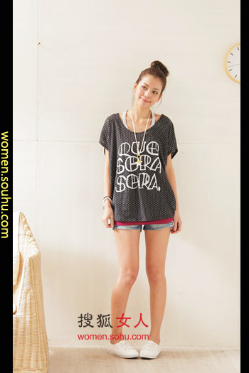 时尚解析:本季大热的叠穿也可以与短裤搭配,脖子上露出吊带的白色边缘,腰部露出红色底边,外搭黑色水玉点点字母T恤,颜色丰富增添层次感。