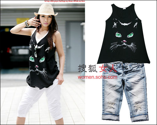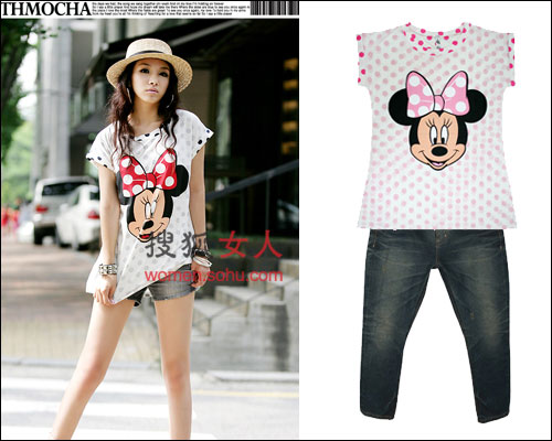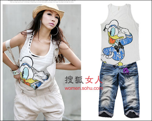 时尚解析:T恤是夏日永恒的主角,尤其是在街头文化和混搭潮流风行的都市生活中,T恤不仅仅是一件夏日凉衫,体现了时尚的变化与永恒,而都市年轻人更是通过T恤来宣扬自我的生活主张和方式,。用唐老鸭图案的TEE+漂白7分仔裤,非常时髦哦!