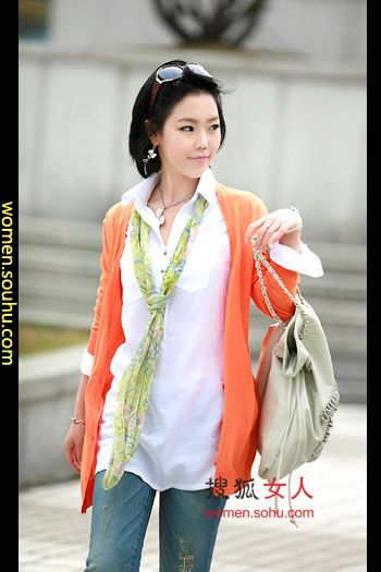 时尚解析:一件亮丽橙色色开衫搭配白衬衫衫与蓝色牛仔裤搭配,知性干练。 绿色印花丝巾与上衣搭配显得温柔甜美。