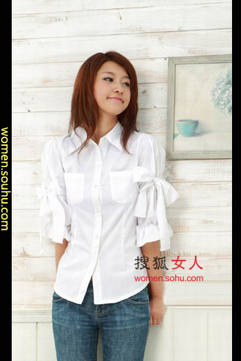 时尚解析:很有设计感的一件衬衫,重点集中在袖子,两边的大蝴蝶结可爱又不失干练,袖口的收紧蝴蝶边使呆板的白衬衫又多了一丝甜美。