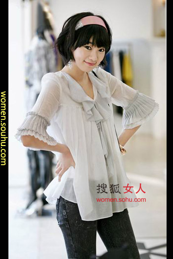 时尚解析:雪纺,又是雪纺,谁让它是夏日必备款呢?纯白色大摆袖子,下边,看上去好像仙女般纯洁飘逸,金属项链使飘逸中增加一丝稳健。