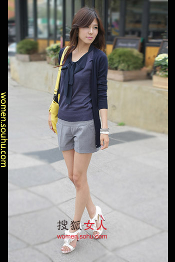 时尚解析:灰色短裤 ,盛夏搭配方式:短裤+吊带/抹胸;秋冬搭配方式:短裤内搭长袜+T恤+外搭毛呢西装
