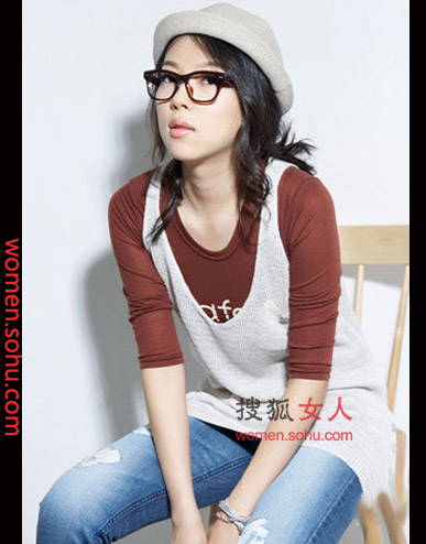 搭配建议:中袖成熟感T恤加上针织的轻薄背心,透出时尚气质,棕色框架眼镜显得复古时尚。