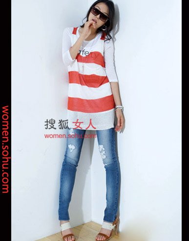 搭配建议:超级透薄的背心外套既可以透出内在T恤原有的印图和款式,又将背心自身的红色条纹的时尚传递。