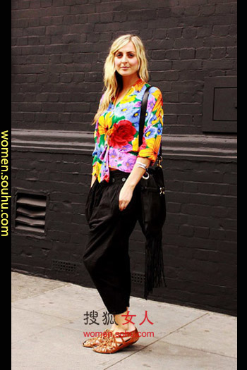 时尚解析:很亮丽吧,上衣图案充满了浓浓的中国气息,这种大花图案上世纪很流行,搭配黑色长裤,下身简单,这种裤型可以很好遮盖肉肉腿。