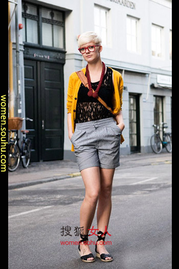 时尚解析:大胆的镂空黑色针织衫,里面靠一件小抹胸保护,搭配剪裁优良的灰色短裤,太暗淡怎么办?罩件橙色开衫,立刻与阳光互动起来