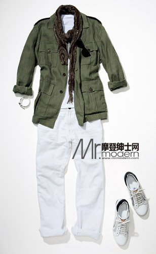 一般来说,夏日里穿加有一条装饰带的长款衬衫式外套肯定不是很舒服。不过,如果外套的材质为亚麻,再取下腰带,挽起袖子,所有问题就都解决了。具有清凉质感的亚麻围巾和复古式太阳镜,都是夏日狩猎风格的很好点缀。