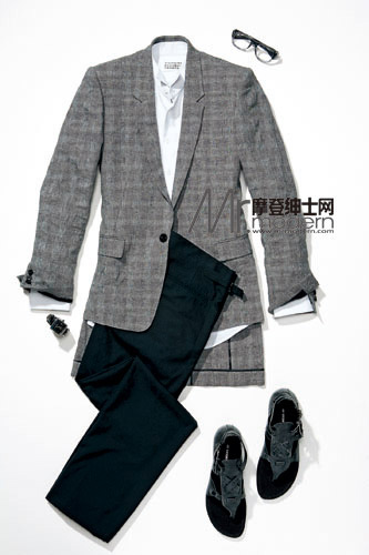 亚麻机车服Time Homme 白色T恤衫Maison Martin Margiela 浅灰色短裤Theory Men 绿色皮质凉鞋Time Homme 狩猎帽Brooks Brothers