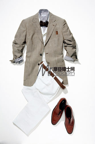 浅棕色亚麻外套S.T.Dupont 格纹衬衫、领结、白色长裤、白色马甲、棕色腰带、棕色皮鞋、圆珠笔均为Lansmere