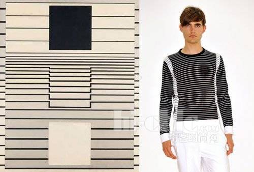 不同角度的条纹拼接在一起便产生出令人眼花缭乱的视幻现象。如红白相间的横条纹和45度角条纹的拼接的Erik Vibskov的圆领T恤衫,再搭配弯曲条纹的背带,简直一副欧普艺术杰作。而Patrik Ervell的放射性条纹让人想到了万花筒。
