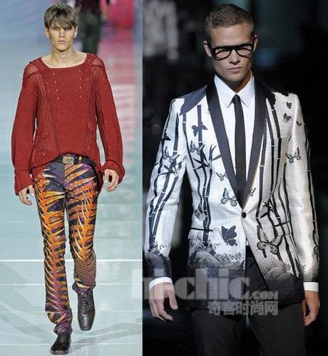 有一些条纹看上去很像条纹,但实际上并不是真正的条纹而是由不同的元素组合,形成类似条纹的样子。如Comme des Garcons和Fendi的外套都采用扎染的工艺效果,其手工质感让条纹若隐若现,Dolce and Gabbana上衣和Roberto Cavalli的长裤都将本身具象的竹子和热带植物图案抽象为较为规则的条纹