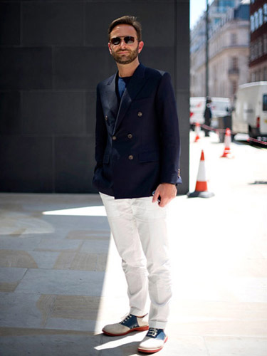 如果你不相信Oscar,那么《Esquire》杂志的编辑JeremyLangmead应该是不容否定的吧?同样穿着了海军蓝色西服的Jeremy,也选择了白色的裤子进行搭配。清爽的白色凸显了海军蓝的夏日气息。想要让自己的深色西服在夏日也能光彩照人,准备一条白色的裤子吧!