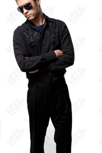 →如果要穿一身黑,适当地考虑印花、提花等图案的黑色衬衫,可以提升整体精致度。