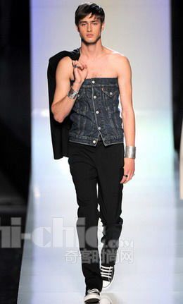 男装设计应该是世界上最简单的职业,女装的legging拿来给男人穿就是megging,heel拿来就是meel,这次移花接木的是抹胸。但看着男模们胸前挤出的沟壑和若隐若现的一撮胸毛,我不认为这是个好主意。Gaultier专门设计女装向迈克杰克逊致敬,而在男装推行“抹胸装”,我不厚道地理解为委婉地提醒杰克逊的妹妹——珍妮杰克逊:好好兜住你的胸,别让它们下次再掉出来……