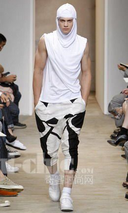再一次印证了男装设计师是天底下最轻松的工作:如果你还记得Viktor& Rolf 06秋冬和Junya Watanabe08秋冬女装的“蒙头”造型,那么Julius和Givenchy在2010春夏男装设计上所作的工作就是照抄,改大尺码,最后做出一些小小的改动——比如将脸露出来。只是当我们穿得像古埃及时代的木乃伊或者是后启示时代的苦行僧一样坐在星巴克里喝咖啡的时候,把邻座的小孩吓哭的机会还是不小的。