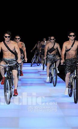 骑单车的少女被Agnes.b在女装T台上沿用了几季,传为佳话。Armani老先生在今年终于让单车出现在男装T台,但一堆精壮裸男却怎么也演绎不出少女与单车的那份默契与神韵,更像是街头的蹩脚艺人,和九分阔腿裤+冷帽+角斗士凉鞋这样不知所云的小丑造型一样,显得弄巧成拙。至于保玲姐就不多说了,一如往昔地将对男人的仇恨对立情绪注入到每一季的男装设计中,乐此不疲,不信你去看Comme desGar?ons那大花被面儿做的萝卜裤……