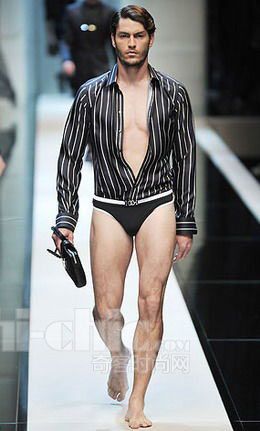 或许女装设计中的内衣外穿风潮刮得实在太劲,还有可能就是LadyGaga穿着内裤上大街的嚣张行为触动了男装设计师某根脆弱的神经,于是这一季的男装也开始饶有兴趣的玩起了内衣外穿,但上正装衬衣下配内裤的造型是不是把男人塑造得过于玩世不恭?这身上下极不协调的打扮,只会让别人认为你是不是刚被歹徒洗劫,甚至会因为你下身过于清凉而误认你是变态的怪叔叔,呜呼……