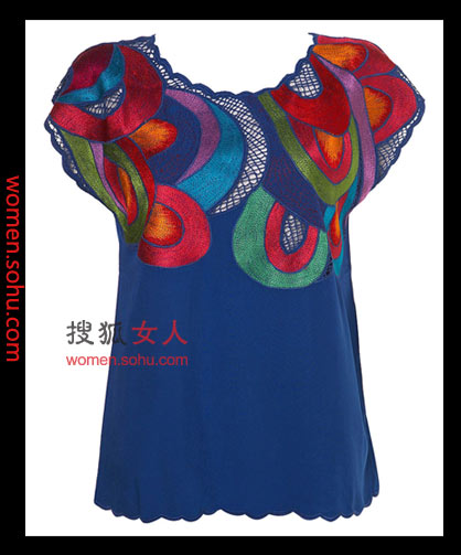 时尚解析:蓝色与各种艳色的大色块组合使整体效果看上去活泼生动,形似T恤的休闲,神似连衣裙般的优雅。
