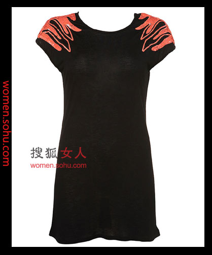 时尚解析:深灰色T恤加入手工绣花的细节,层层叠叠的效果,胸前的装饰提亮T恤整体,中长的长度更进一步的性感。