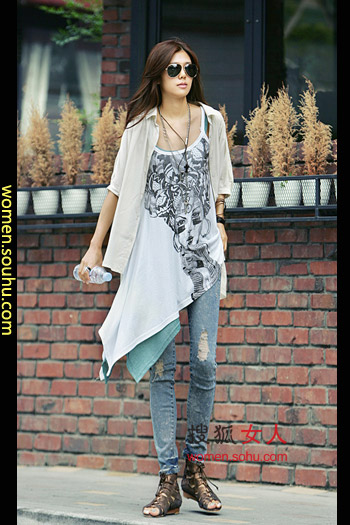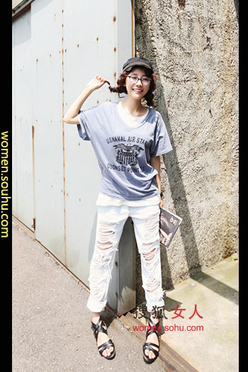 时尚解析:白色不等式宽松上衣搭配破破的收腿牛仔裤,罗马风凉鞋非常有感觉,外搭的轻薄开衫增添丰富的层次感,白色与蓝色的搭配充满了帅气的休闲感!