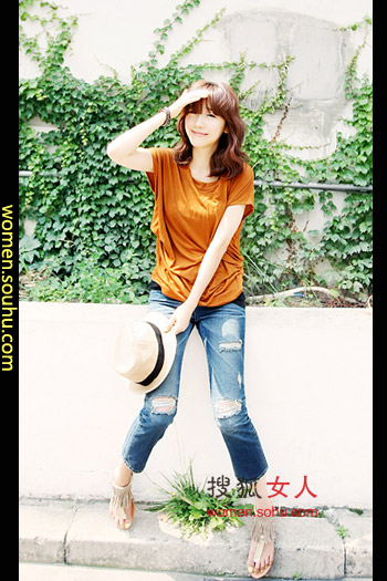 时尚解析:破坏力度最强的一款牛仔裤,裤脚挽起,充满浓郁街头风,搭配灰色两件式T恤,充满迷人的韩式味道,丰富的层次感让整体搭配特别有魅力!