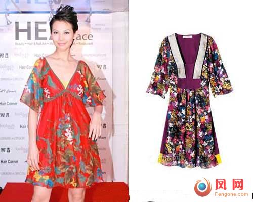 参考自蝴蝶型的设计方案让蔡少芬的这件连衣裙性感又有民族味,小A字型的款式最受欢迎,腰腹部的赘肉完全不见了踪影。但身材过于臃肿的女性绝对不适合这种大花色的宽松款式,只会让你更膨胀。